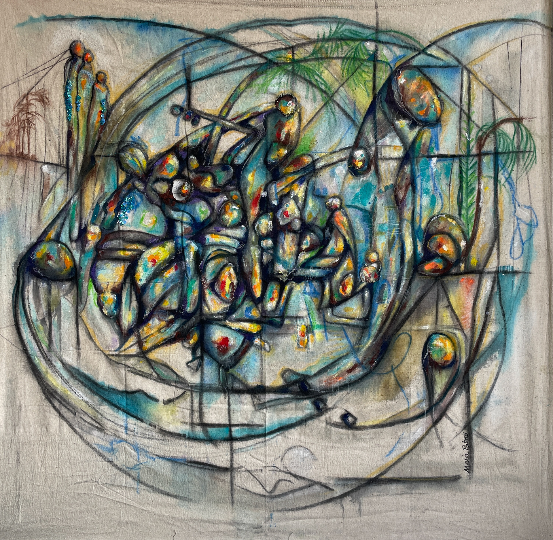 Maria Patiño, El Reencuentro, Mixed media on canvas, 84 x 64"